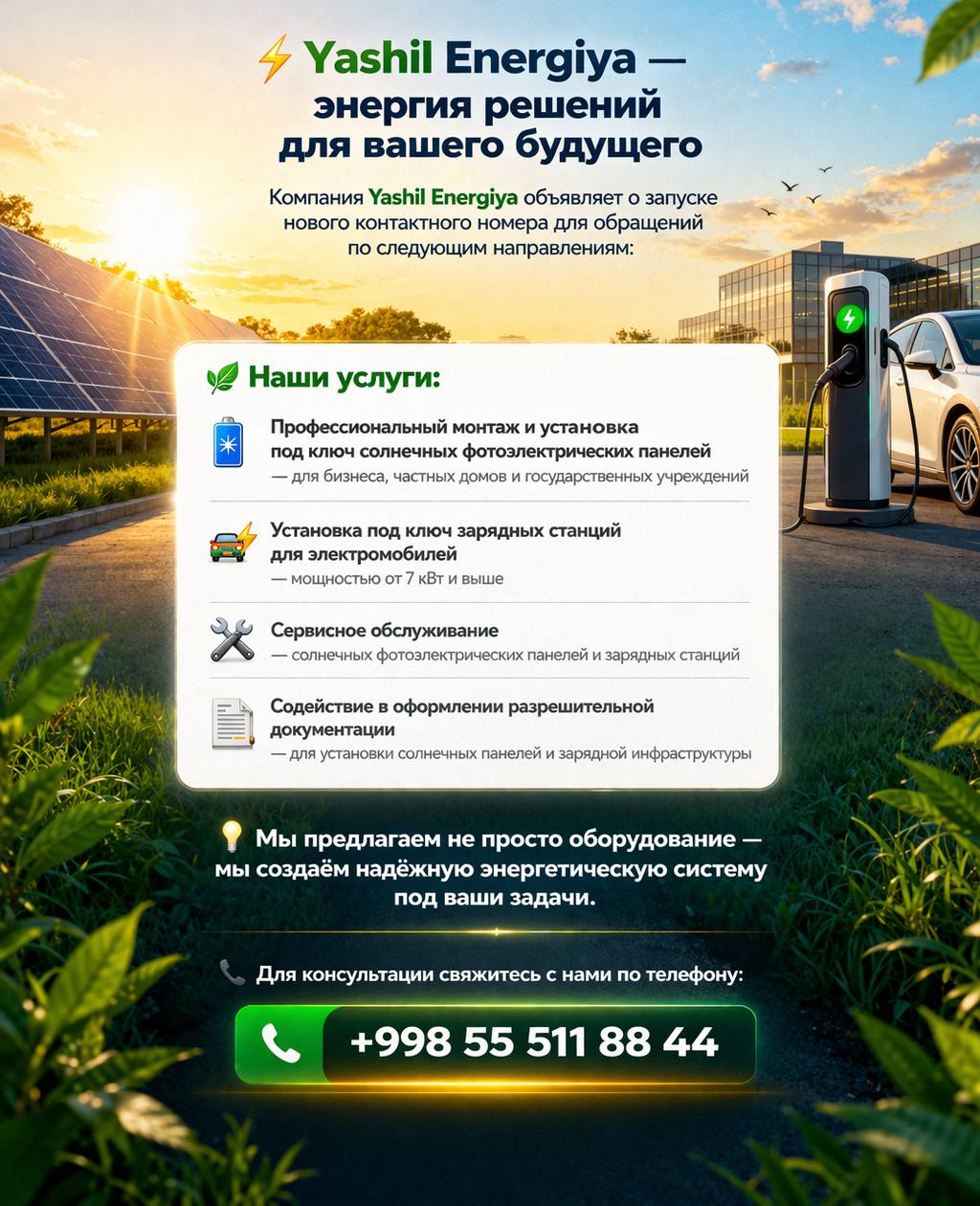 Компания Yashil Energiya объявляет о запуске нового контактного номера для обращений по следующим направлениям